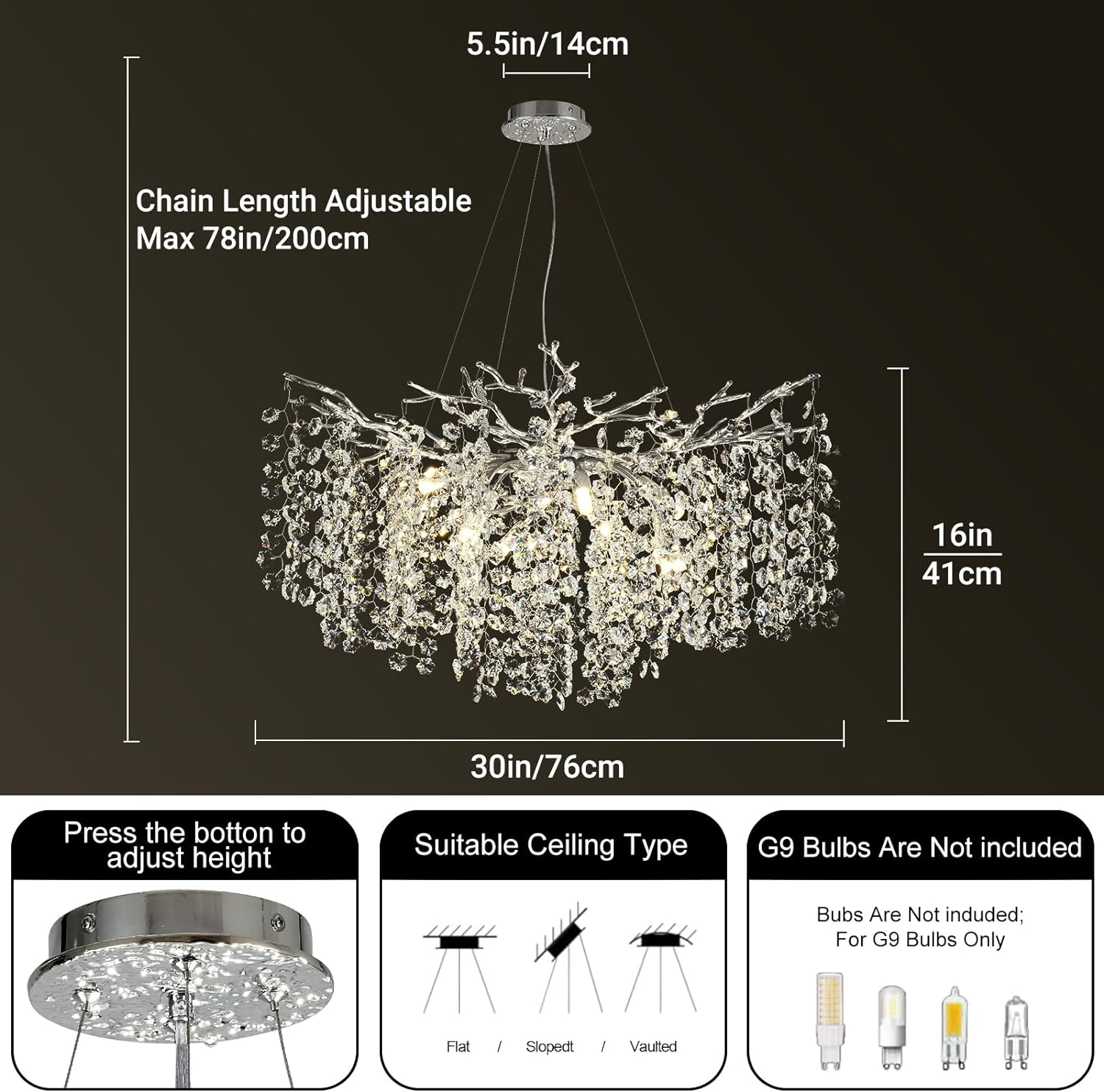 - 💫【Easy Assembly & Adjustable Design】With a size of L30" x H16" and an adjustable cable length of 0-66 inches, installation is effortless. The aluminum alloy branches are lightweight yet sturdy, easily removable, and assembled. Hang the crystals, ensuring the front side faces up. Refer to the instructions for guidance.