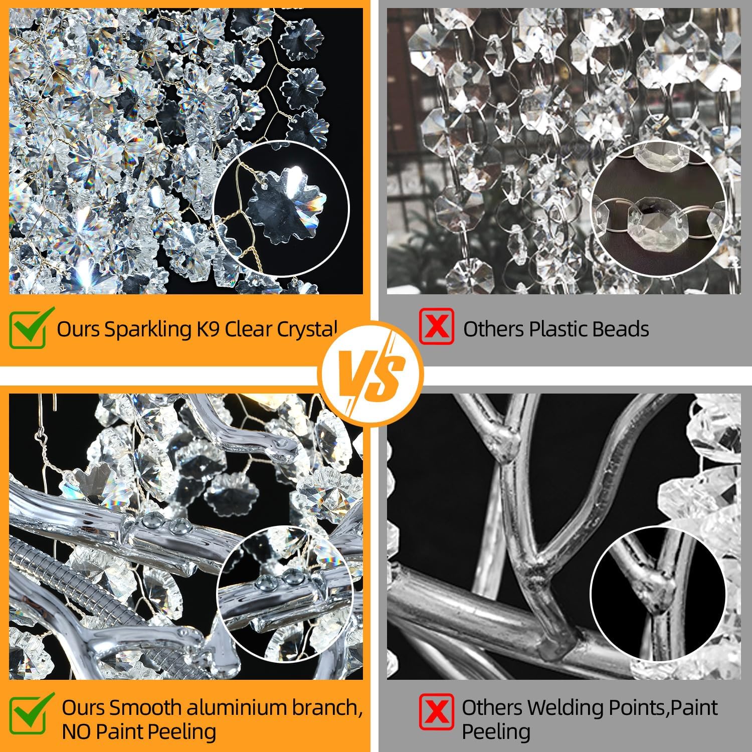 - 💫【Pure Snowflake K9 Crystal for Artistic Beauty】Elevate your home decor with the exquisite sparkle of our Snowflake Crystal Silver Chandelier. When illuminated, the entire lamp emanates an artistic beauty that enhances the ambiance of any room.