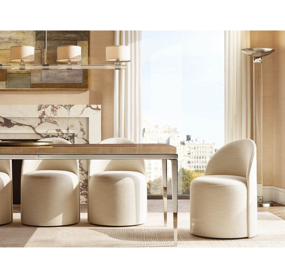 - Each arm is fitted with an Ivory linen closed-top drum shade