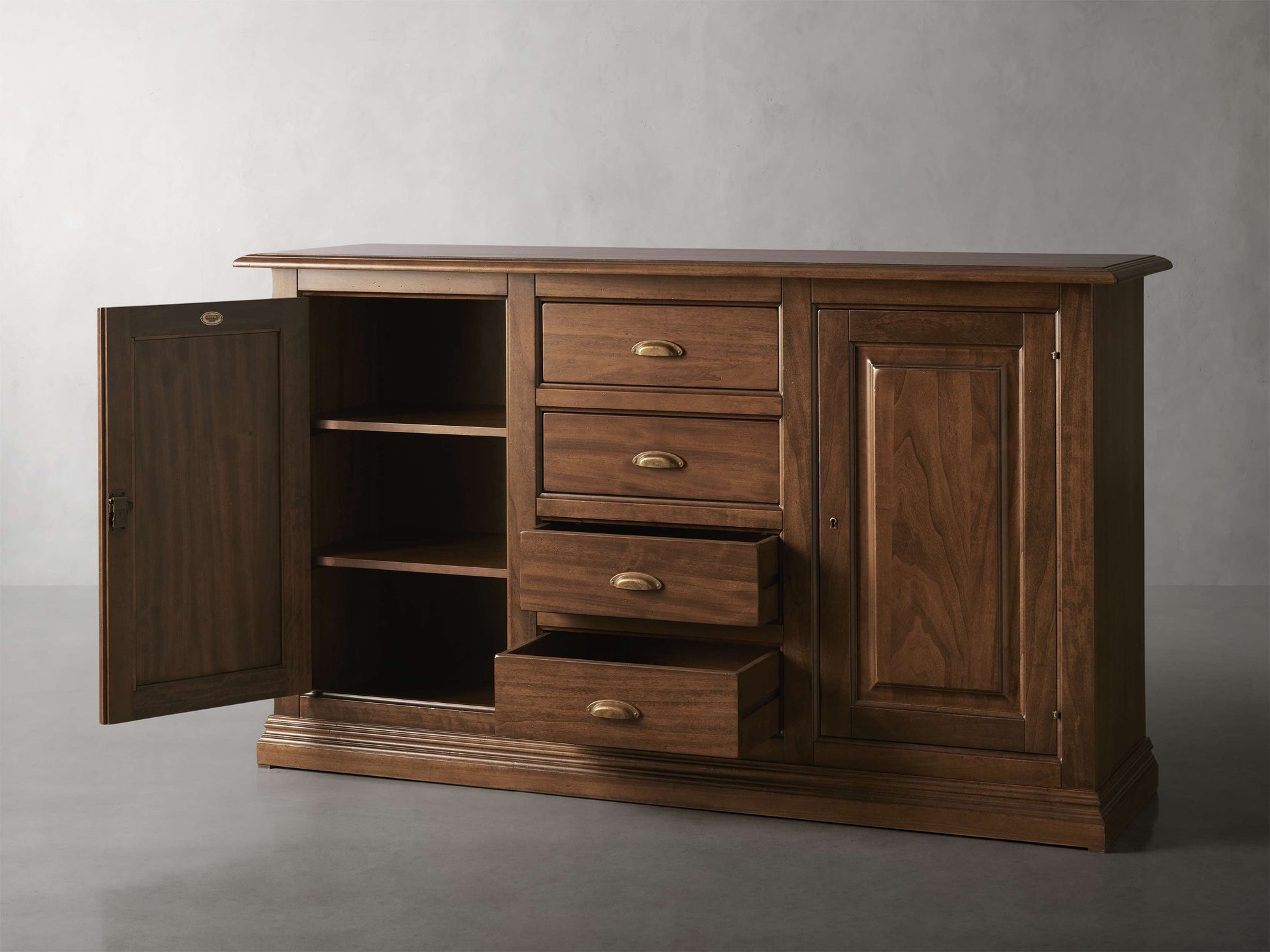 - Features two cabinet doors, an adjustable shelf, and four drawers.