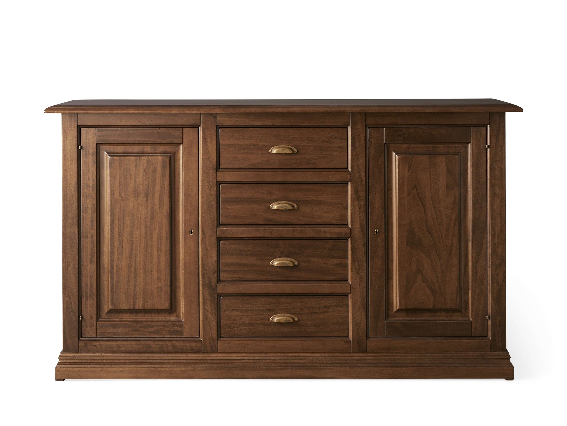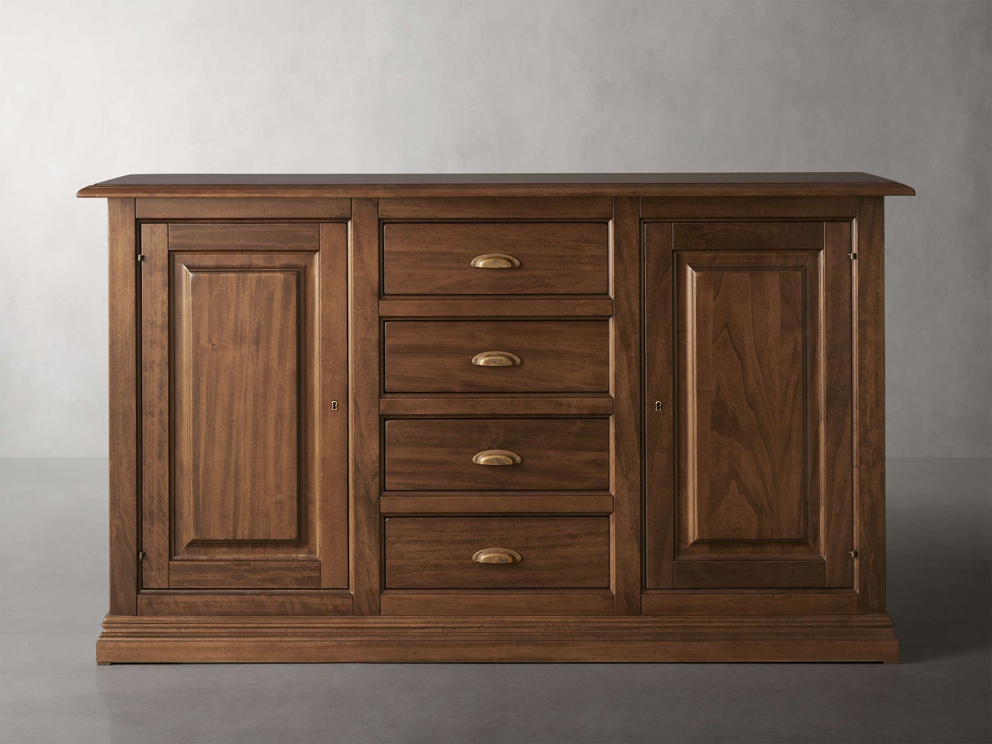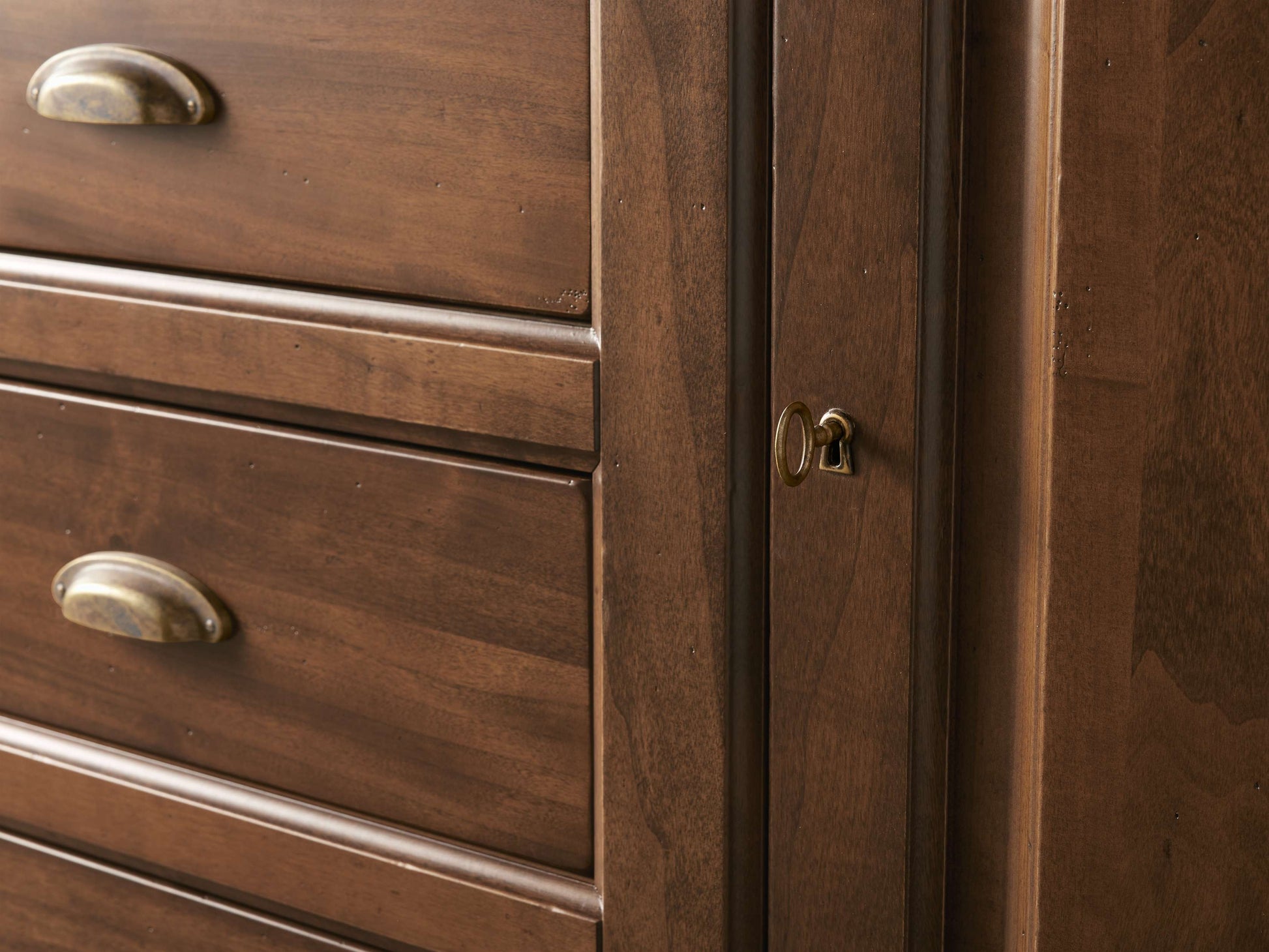 - Vintage-inspired antiqued brass pharmacy pulls and key closures accentuate cabinet doors and drawers.