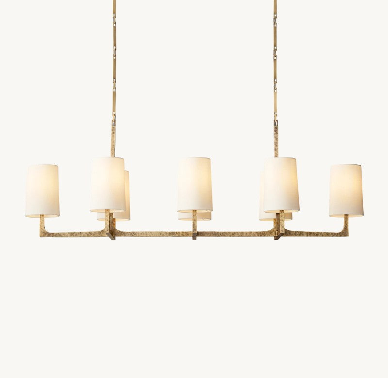 Spare and elegantly minimal, our fixture defines refined simplicity. A hand-forged, hammered metal frame – its arms perfectly tapered – showcases a tailored white linen shade. An exercise in balance and proportion, it conjoins light and dark, crisp right angles and understated curves.